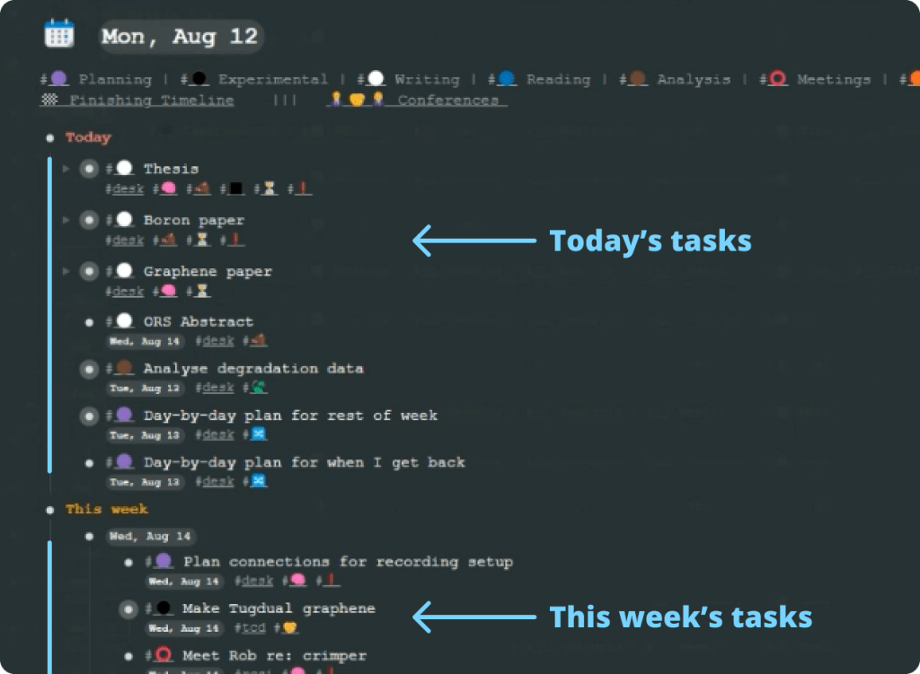 By carefully tracking his work in Workflowy, Jack creates a comprehensive record of his PhD journey. From his daily todos to his high level plans and idea. It’s become the backbone of his productivity system, ensuring nothing falls through the cracks.