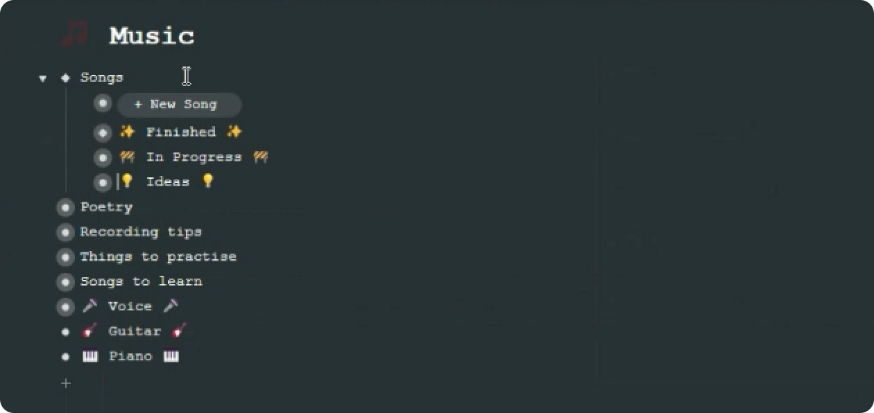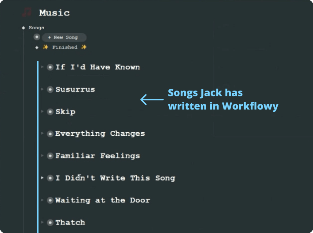 Workflowy’s flexibility also allows Jack to easily rearrange sections, experiment with different lyrics or progressions, and see the evolution of a piece over time