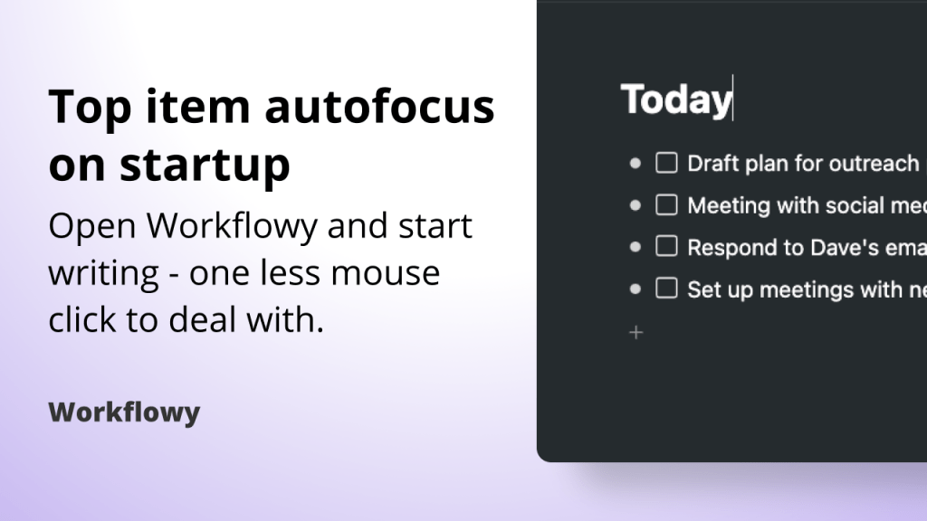 Hey there folks, today’s change is a small one but you’ll notice it if you’re an avid keyboard shortcut user. Previously, whenever you opened Workflowy, you would have to first click somewhere in the app and then you would be able to start writing. Now we automatically focus on the topmost item so you don’t have to take your hands off the keyboard.