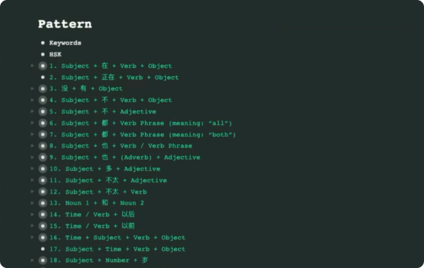 - Then under each pattern, he includes Mandarin sentences that exemplify the pattern